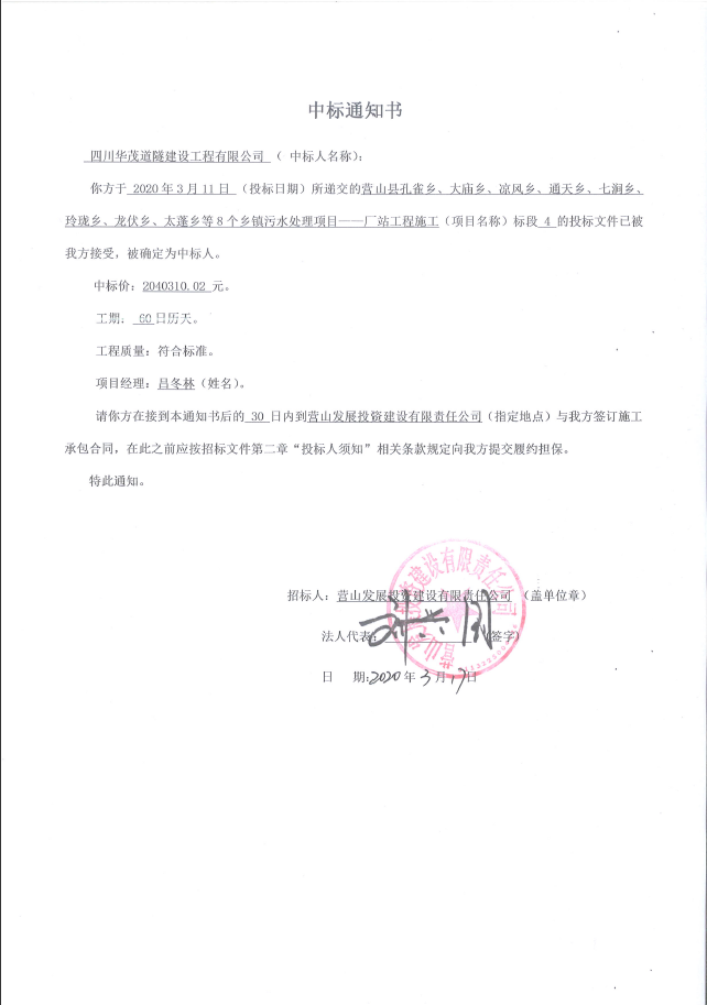 营山县孔雀乡、大庙乡、凉风乡、通天乡、七涧乡、玲珑乡、龙伏乡、太蓬乡等8个乡镇污水处理项目——厂站工程施工四标段中标